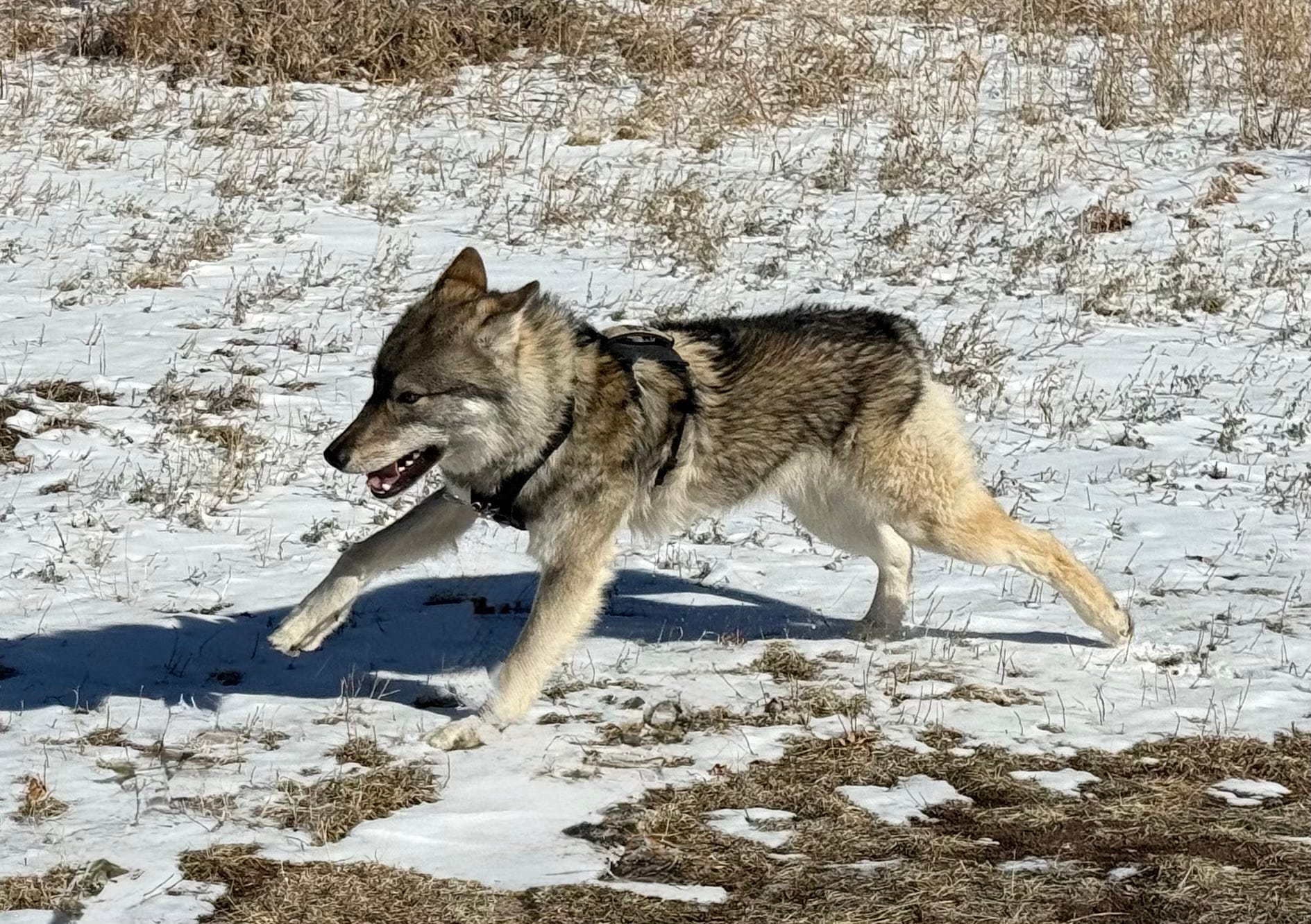 Here’s a photo of Zuni, our wolf cub companion doing what wolves do in the snow.