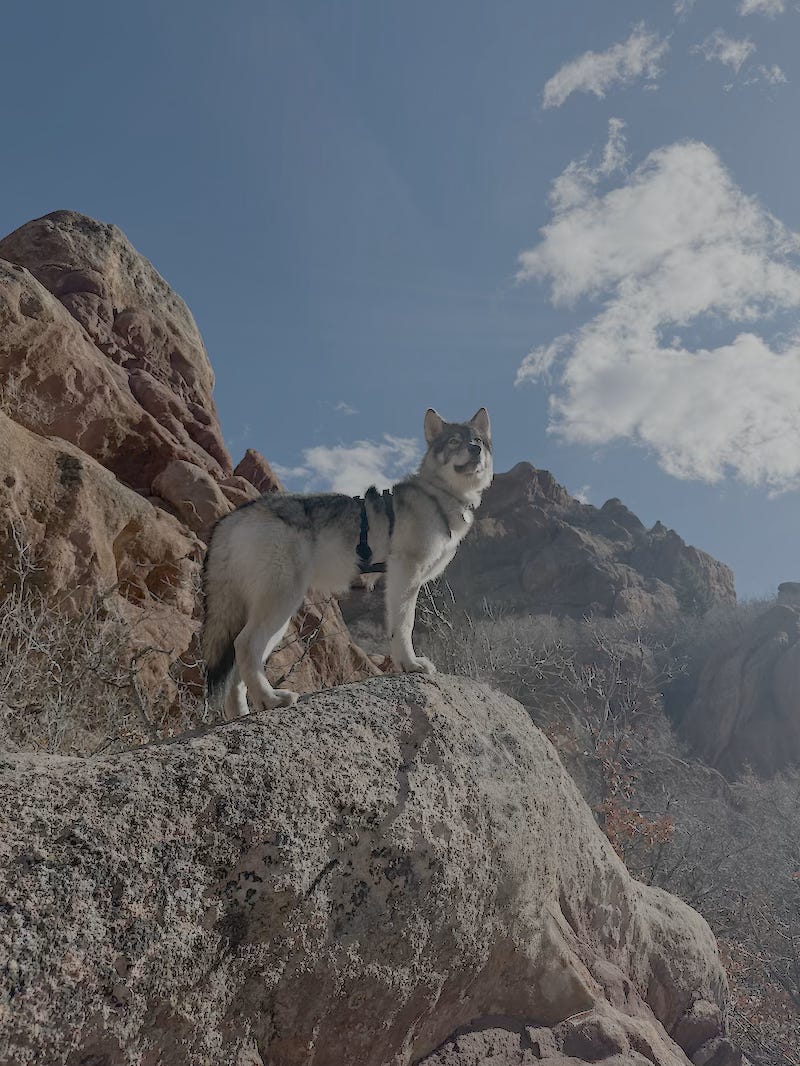 In the meantime, here’s a photo of our rescued/adopted wolf cub companion Zuni at ten months on a hike in the Rockies.